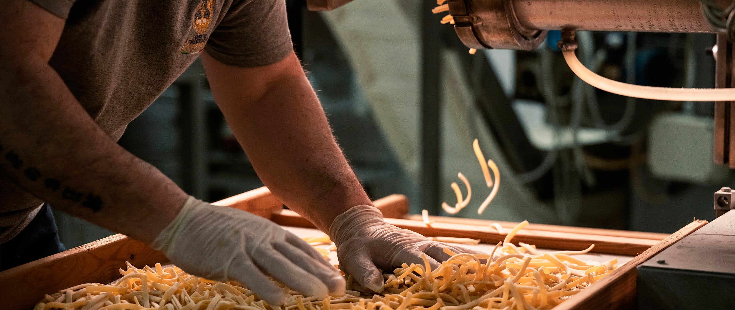 Prende forma lentamente, tra mani, lavorazioni e materia che cambia. È qui che la pasta diventa Pasta di Gragnano.